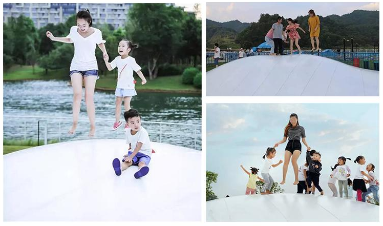 外膜原料選用耐磨、抗紫外線、白潔的高強度膜材,游樂場設備蹦蹦云,保證外膜長期踩踏、暴曬、彈跳后,仍然保持清潔;可持久的固定在地上,拆開維修方便。